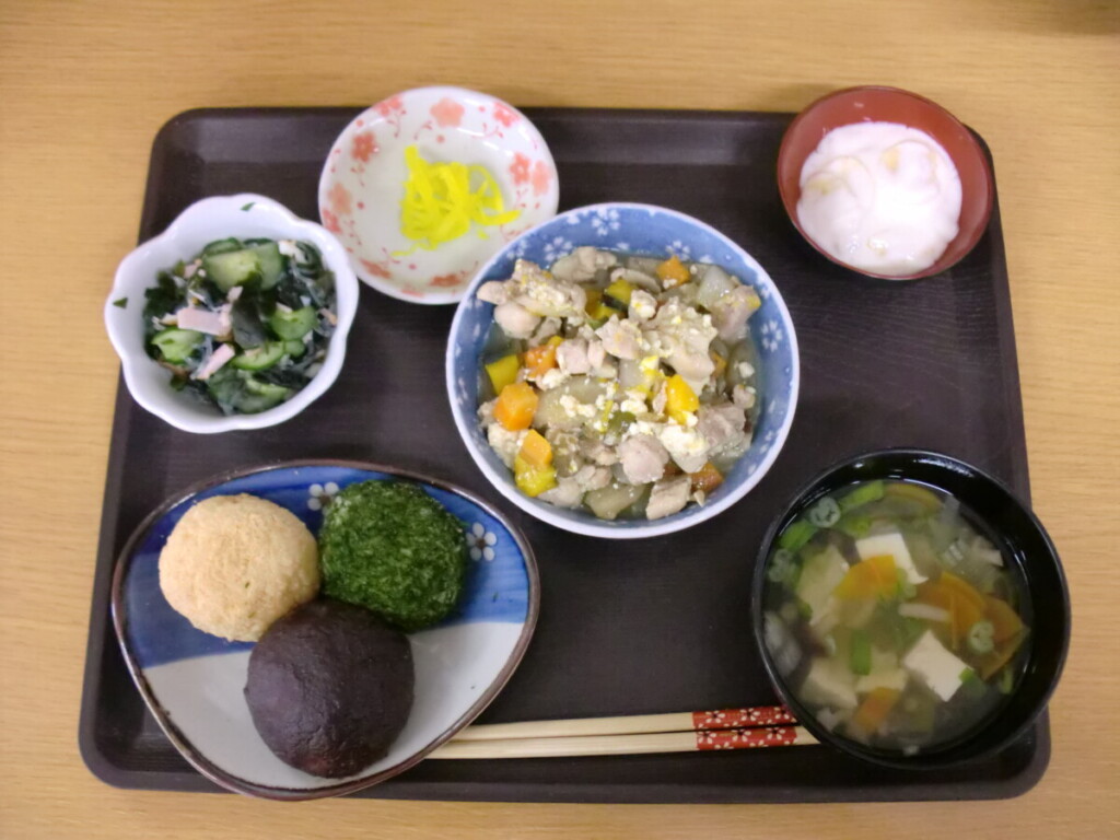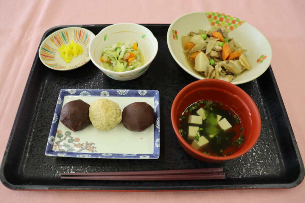 秋の訪れ、秋分の日です。秋のお彼岸にちなんだメニューをご用意しました(*^-^*) 甘いおはぎの懐かしい味わいに、笑顔で召し上がっておられました(^^)/ -