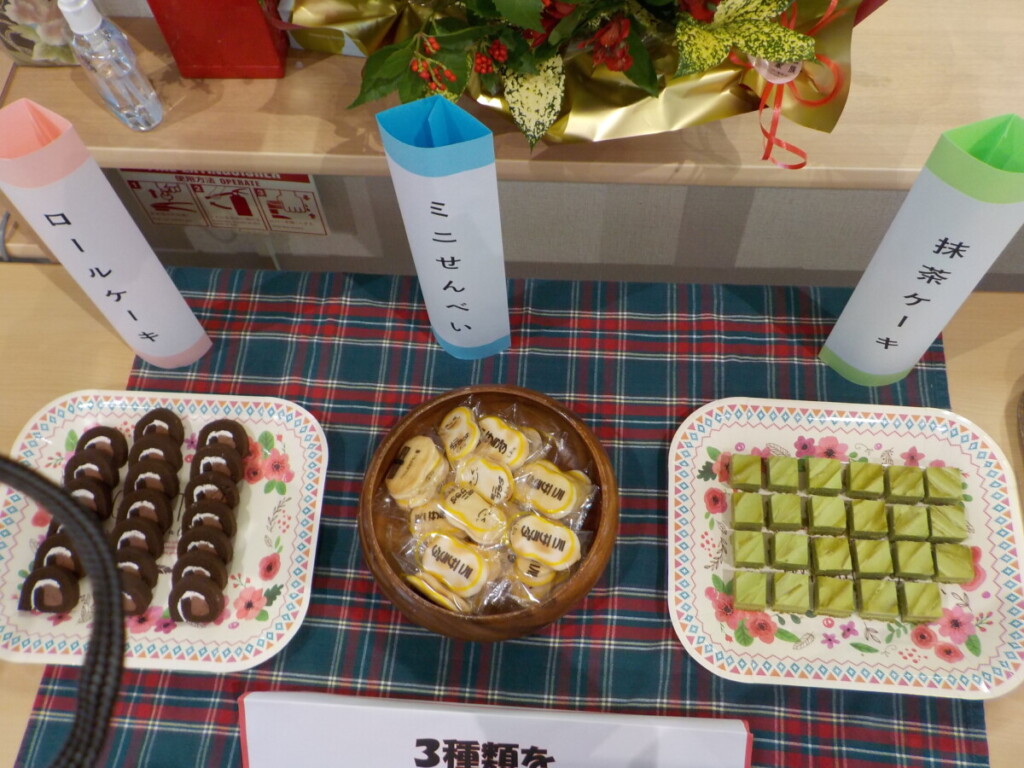 「チョコロールケーキ」「抹茶のケーキ」「ミニせんべい」